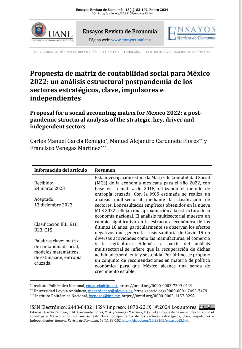 Propuesta de Matriz de Contabilidad Social para México 2022: un Análisis Estructural Postpandemia de los Sectores Estratégicos, Clave, Impulsores e Independientes, Ensayos Revista de Economía, 43 (1), 83-102, with C.M. García